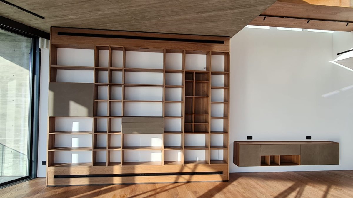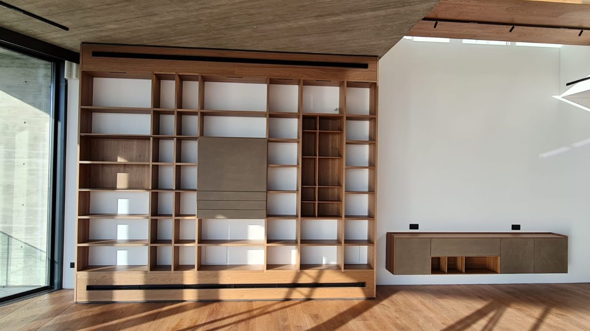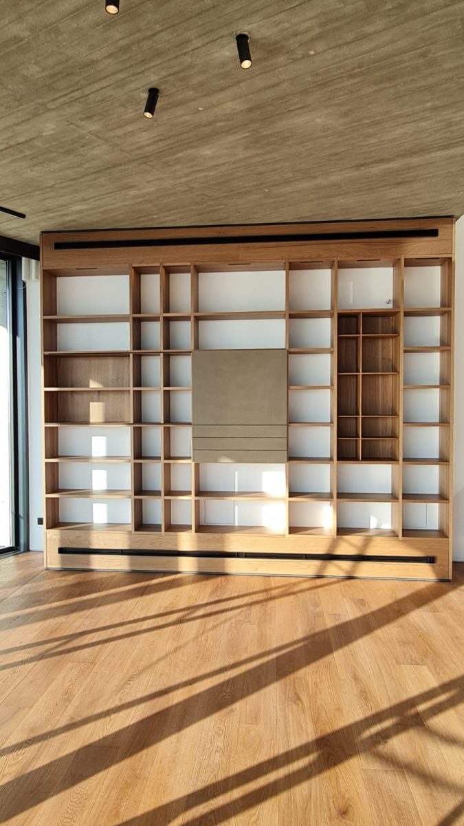 The bookcase acts as a statement wall. It combines storage, display and visual balance into a single, cohesive structure that feels intentional and refined. Each section serves a purpose, contributing to a sense of order and clarity.