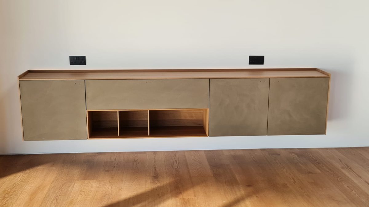 The TV unit complements the space in a subtle way. Designed to support functionality without adding visual weight, it completes the composition while allowing the room to remain open and calm.
