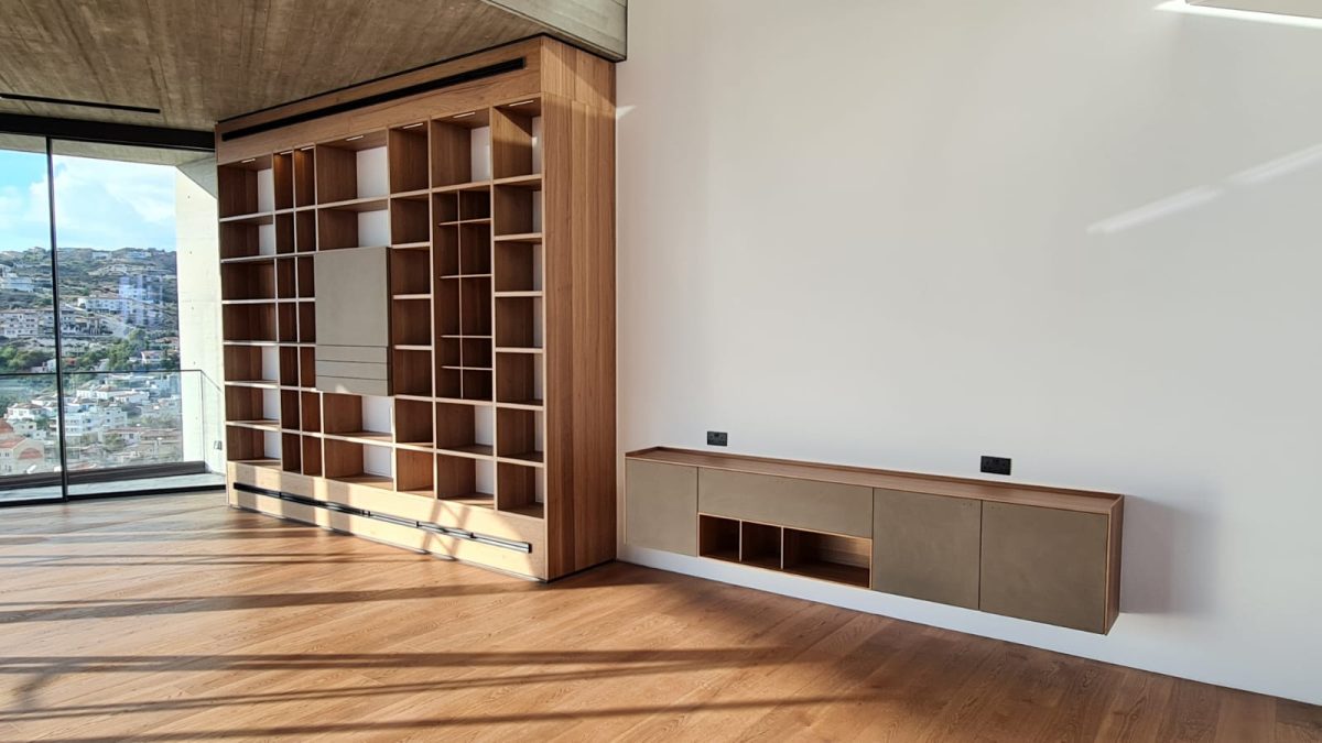 This project in Larnaca features custom made bookcases and a TV unit, designed exclusively for the space and its architectural character. Every element was carefully studied to fit seamlessly, both in scale and function.